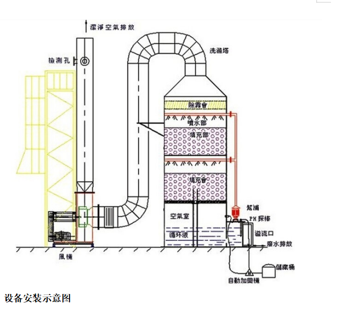 的药水吸附液种类。药水通过喷洒装置均匀分布设备中,依靠重力作用自上而下流动,并与在压强差推动下穿过的气体相互接触,发生传热和传质。废气/粉尘/油雾由药水吸收液吸收,由于药水液体的吸收存在着吸收饱和及吸附逃逸的现象,因此当药水液体吸收达到饱和前及逃逸严重时,应及时更换药水吸收液以确保排放废气的有害物质的含量在排放标准要求以下。