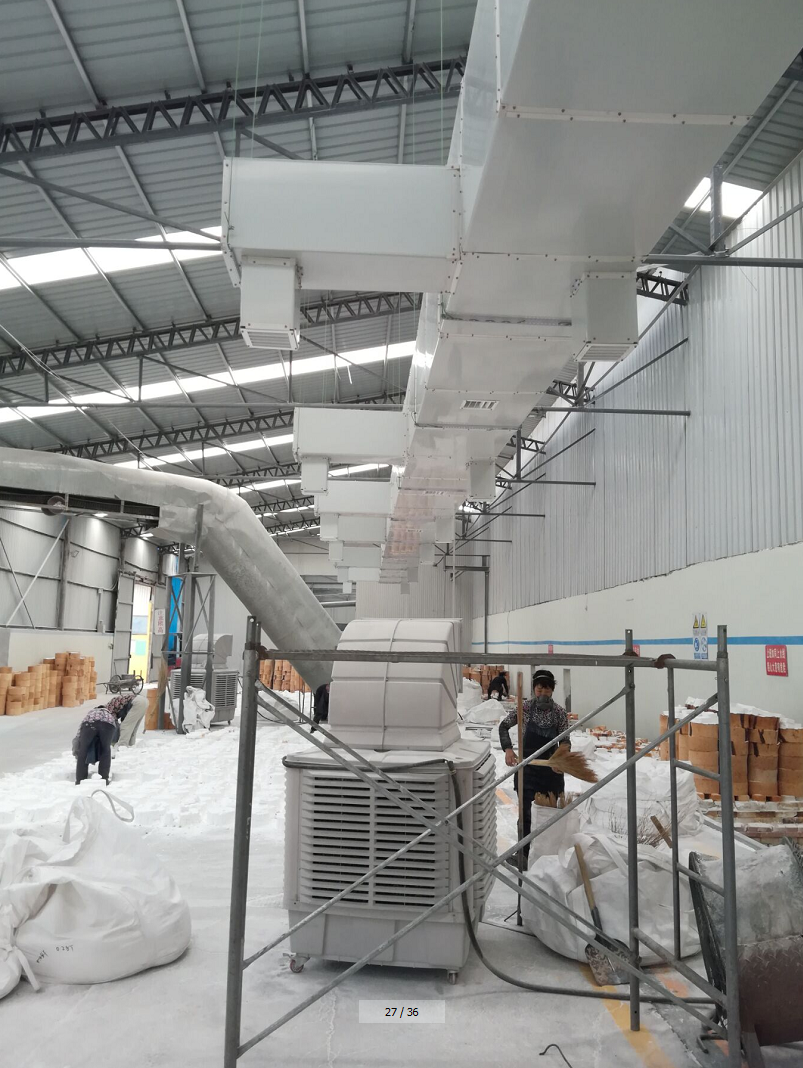 机组30台,设计机组在车间顶部平均分布安装,底部连接通风管道短接向下送风,机组运转将新鲜的冷空气输送到车间内部。经测试车间内温度降低10度左右,效果明显。